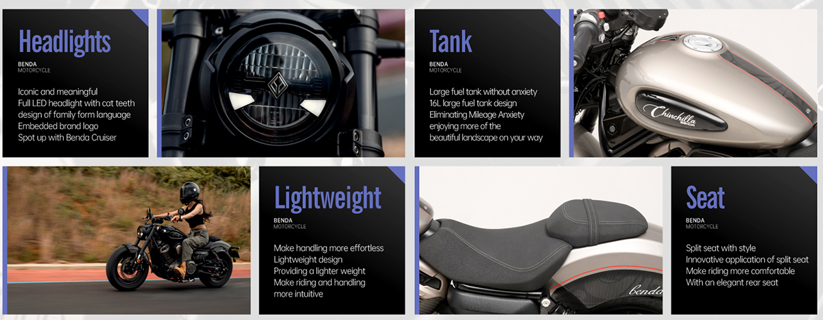 Thùng xăng Benda Chinchilla 500 thiết kế rất đẹp, hoàn toàn mới không vay mượn bất cứ loại xe mô tô nào, màu sắc động cơ cũng là điểm nhấn gây chú ý cho người đi trên đường.